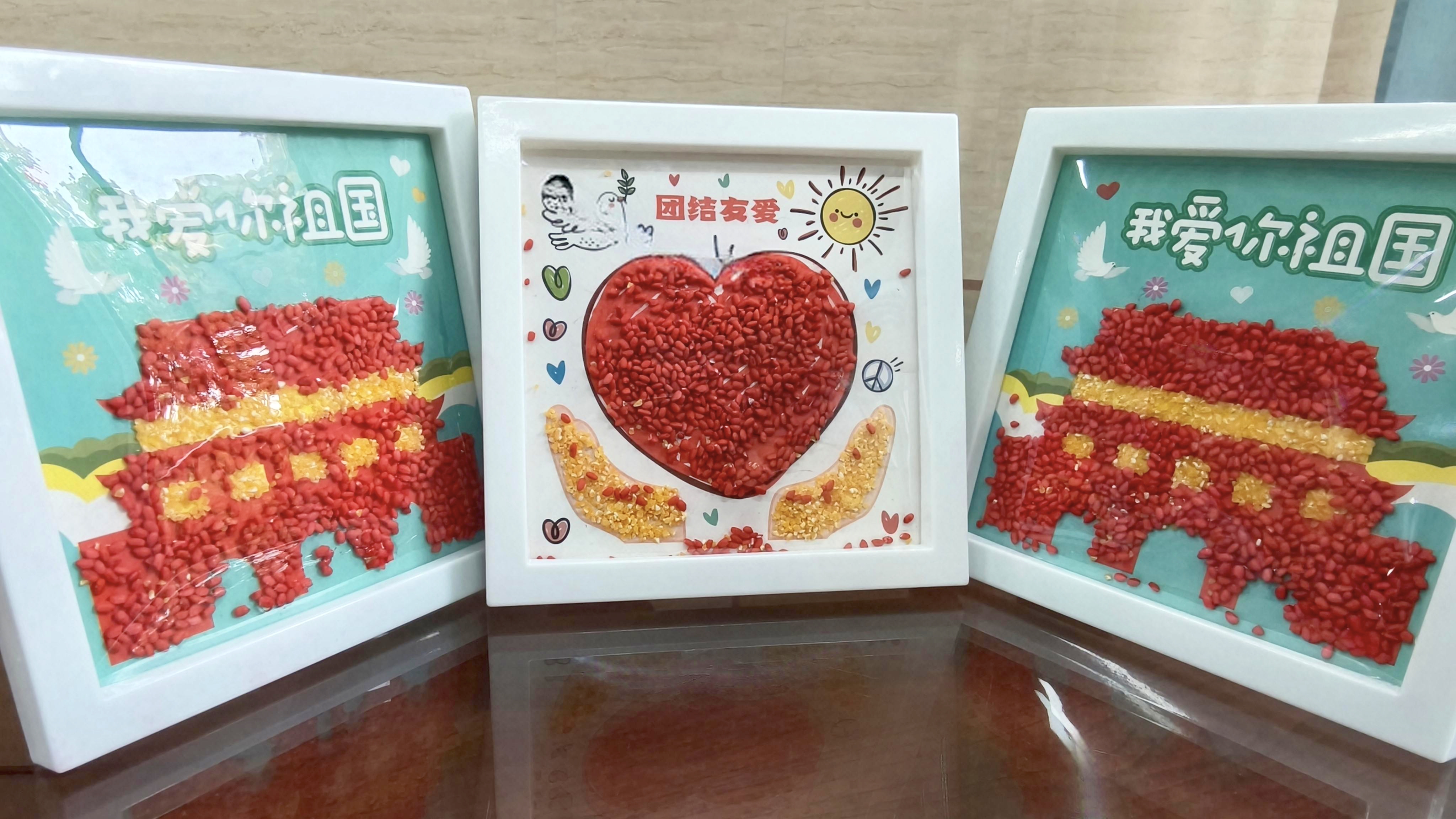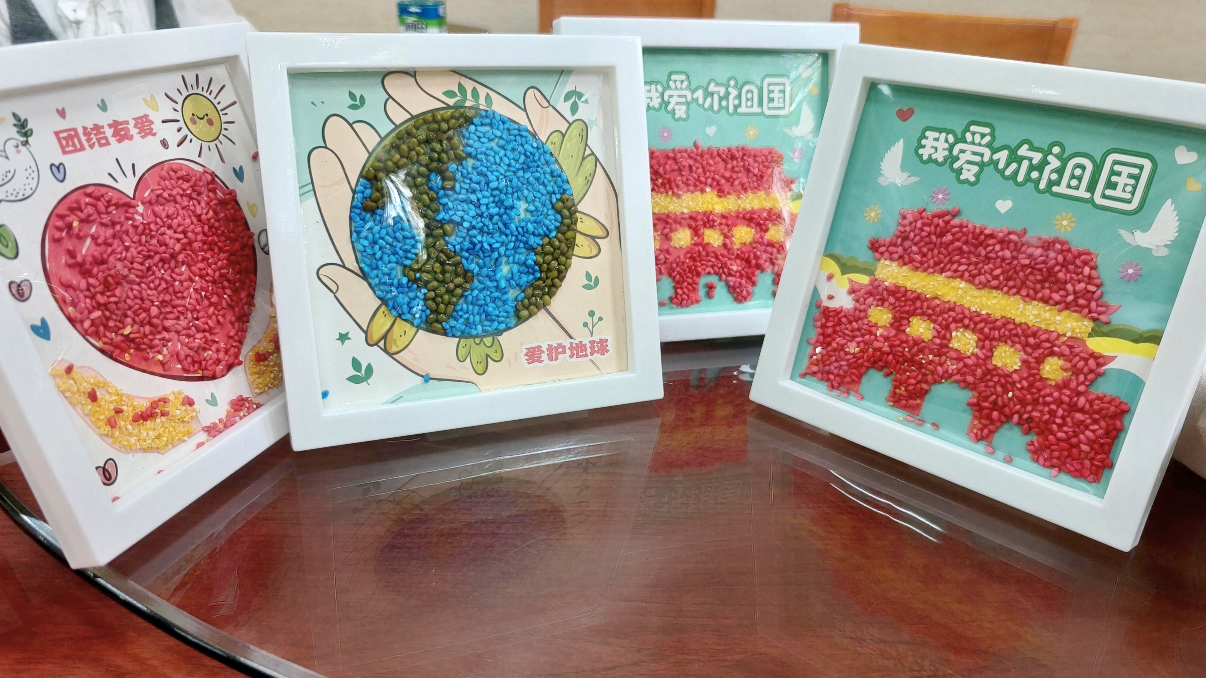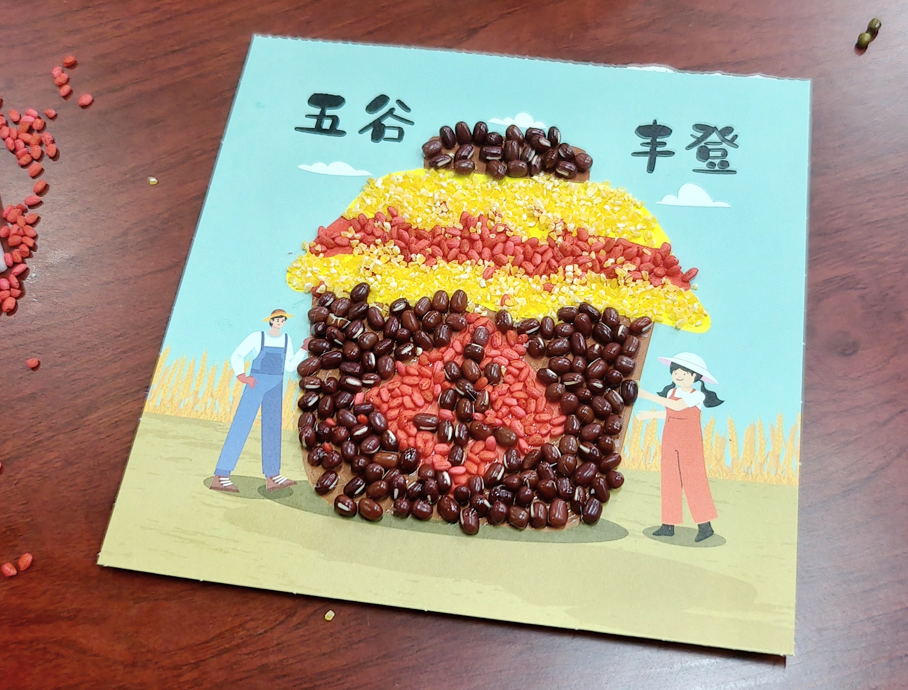 活动以轻松有趣的粮食知识问答开场,同学们踊跃参与,现场气氛活跃。在创作环节,大家利用红豆、小米等杂粮进行拼贴画创作,将不同颜色的杂粮巧妙粘贴于纸板上,形成一幅幅富有创意的作品。