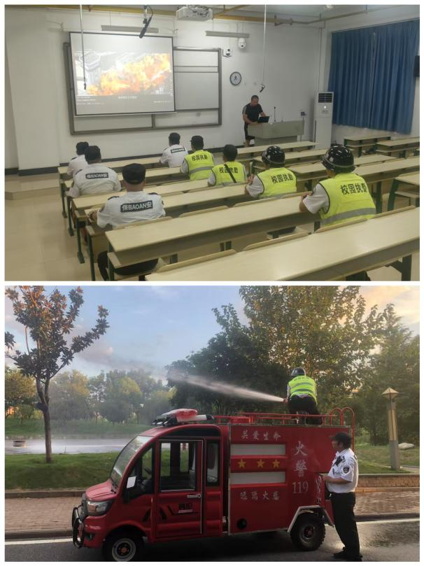 7.为提升校园安全防范意识,强化火灾应急处置能力,组织安保人员观看校园火灾警示片并开展消防安全灭火演习。