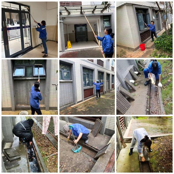 2.卫生清洁:全面清洗学校各区域脏污地面、垃圾桶及垃圾场周边污渍;对图书馆开展金字塔清洗,清理书架顶部灰尘,消毒清洗卫生间,保养电梯不锈钢。