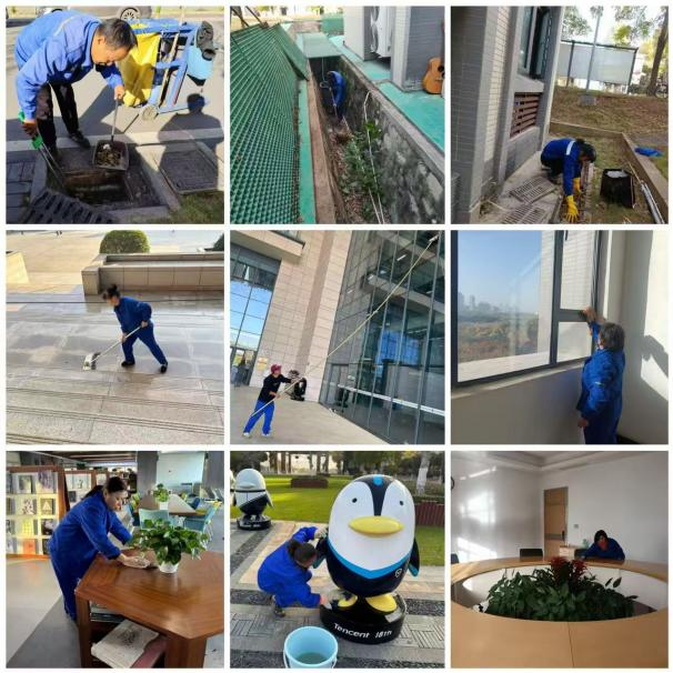 2.卫生清洁:全面清洗学校各区域脏污地面、垃圾桶及垃圾场周边污渍;对图书馆开展金字塔清洗,清理书架顶部灰尘,消毒清洗卫生间,保养电梯不锈钢。
