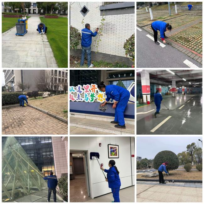 2.卫生清洁:全面清洗学校各区域脏污地面、垃圾桶及垃圾场周边污渍;对图书馆开展金字塔清洗,清理书架顶部灰尘,消毒清洗卫生间,保养电梯不锈钢。